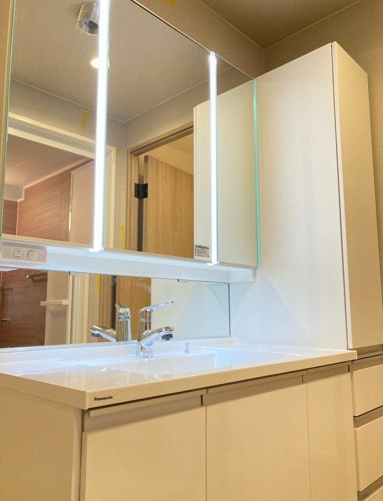 洗面台は収納力が高く、手元部分にも鏡がついていたり、ライトが縦に